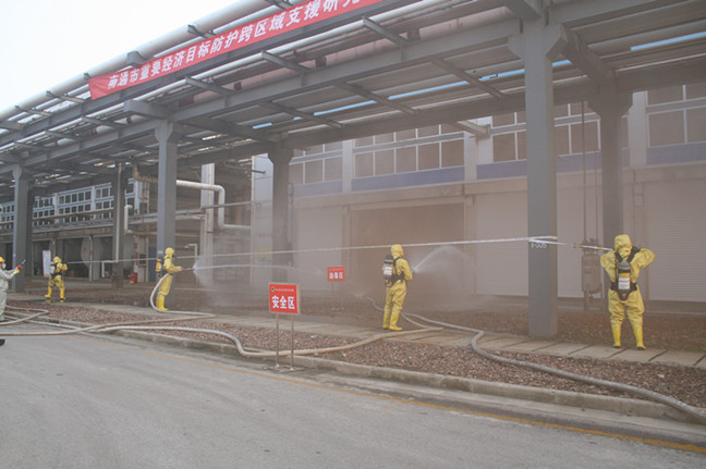 只見噴淋洗消裝置在值長的指示下及時開啟??傊笓]接到報告后立即指示啟動氯氣泄漏應急預案,并通知公司防護專業(yè)分隊至泄漏區(qū)進行搶險救援。隨著現(xiàn)場氯氣的擴散,氯堿事業(yè)部的SIS系統(tǒng)自動啟動,液氯泄漏區(qū)的廠房全部自動關(guān)閉,氯氣吸收系統(tǒng)自動啟動,將泄漏的氯氣封閉在廠房內(nèi),防止氯氣向外擴散。公司對重大危險源管控的工程措施在此刻發(fā)揮了重要作用,為應急堵漏贏得了時間。演練中,參演人員各司其職,現(xiàn)場加強警戒進行標示,及時疏散人員,快速處置氯氣泄漏,緊急搶救中毒人員,時刻監(jiān)測周邊環(huán)境……