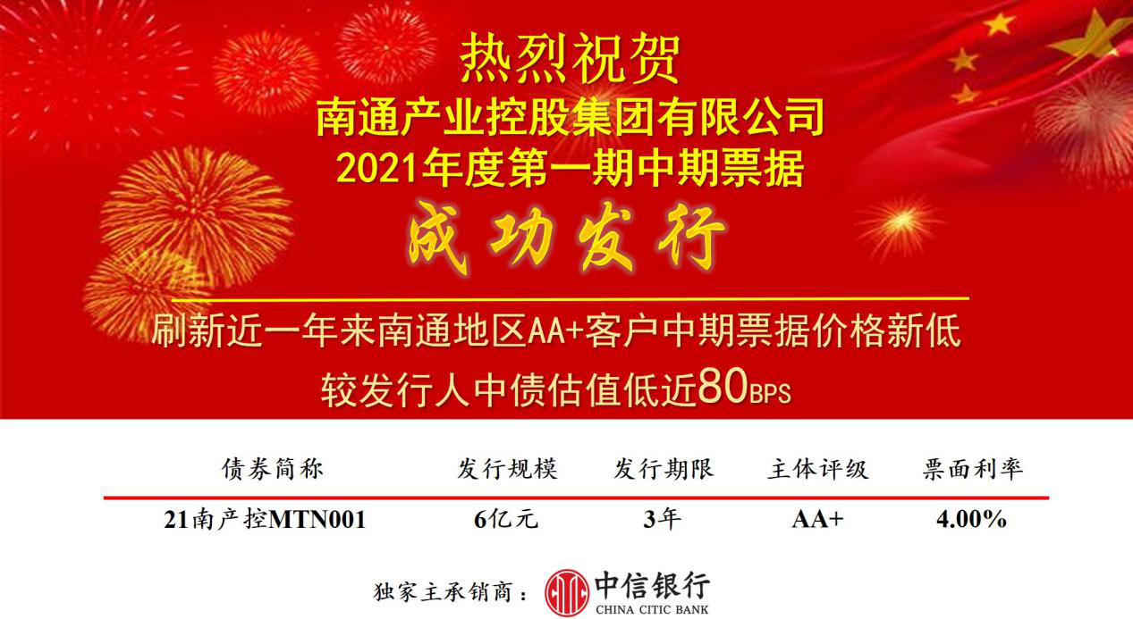 2021年422,產(chǎn)控集團(tuán)成功發(fā)行6億元中期票據(jù)。由于產(chǎn)控集團(tuán)的良好資質(zhì)得到投資者的認(rèn)可,本期中票簿記倍數(shù)1.6,邊際倍數(shù)1.16倍,票面利率4%,比集團(tuán)三年期債券估值近80BPS,同時創(chuàng)下了近一年來南通地區(qū)AA+評級中期票據(jù)價格新低。