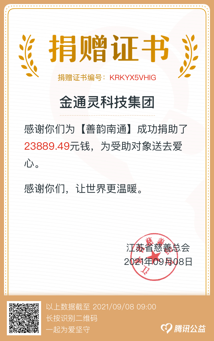 近日,我市組織開展“博愛在南通 慈善暖江海”慈善一日捐活動(dòng),金通靈積極響應(yīng)產(chǎn)控集團(tuán)的號召,第一時(shí)間組織開展一日捐活動(dòng)。截止到9月8日,金通靈共籌得善款23889.49元,募集資金將統(tǒng)一交至南通市慈善總會(huì),繼續(xù)用于扶貧、慈善救助項(xiàng)目。
