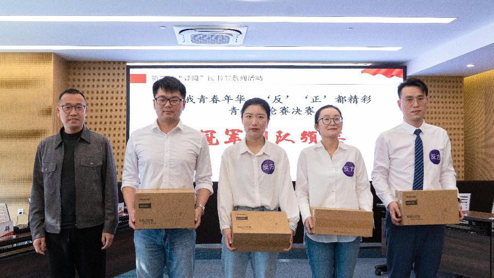 頒獎環(huán)節(jié)公布了好書薦閱活動中投票前十名的選手,他們將獲得集團(tuán)黨委書記《帶著工匠精神去工作》贈書一本。吳玉祥為在“好書漂流、愛心無限——跳蚤書市”活動中,個(gè)體捐書121本的來自制劑生產(chǎn)公司的陳帝舒頒發(fā)了精華捐書達(dá)人獎。周云中為正方越琢磨越隊(duì)頒發(fā)了亞軍團(tuán)隊(duì)獎。尹紅宇為反方傳承精華隊(duì)頒發(fā)了冠軍團(tuán)隊(duì)獎以及為正方二辯郭佳燕頒發(fā)了最佳辯手獎。